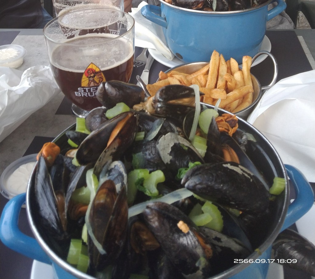 Niettemin waren de mosselen (arme mensenkost van vroeger volgens den broer. Maar nu heeft men de keuze tussen jumbo, super of goudmerk volgens grootte, naar de prijs te zien zal men in de toekomst met karaat werken) van uitstekende kwaliteit en vooral lekker. Wat een smakelijk donker bier uit Brugge ons bezielde was een raadsel, maar niet slecht gekozen, met zijn iets gecarammeliseerde afdronk paste het er wel bij! Je moet de buren van over het water ook iets gunnen hé. Met de frieten kon je letterlijk bouwen. Alles was best lekker zoals het hoort….dus geen klagen!
